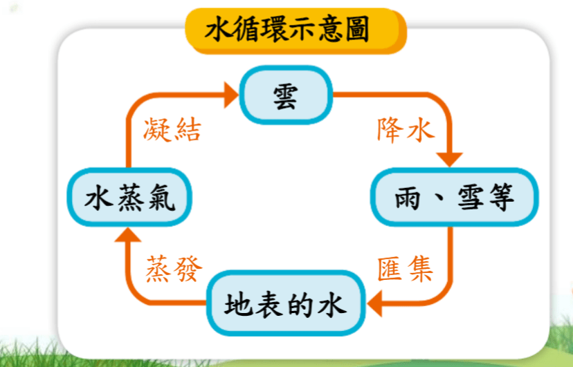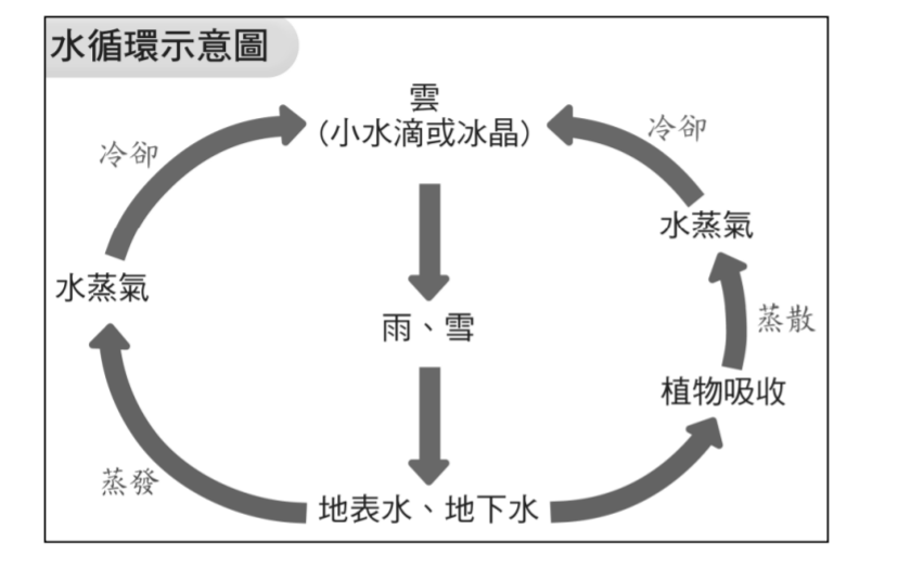 水循環 : 地球上水的總量不變,水的固態、液態、氣態反覆循環過程叫做水循環